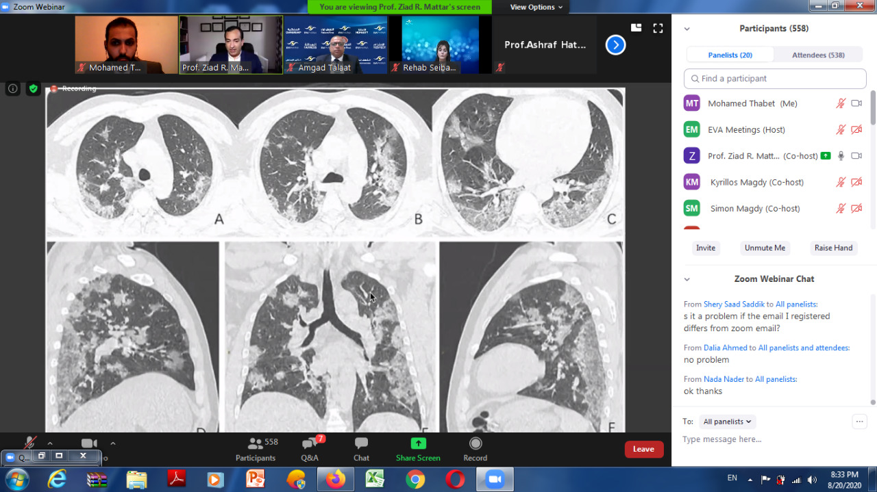 شارك في “الندوة”، عدد من الخبراء والمتخصصين بمجال مكافحة فيروس كورونا، والصيادلة، والأطقم الطبية، وهي الندوة التي تحدث خلالها الدكتورة جيهان العسال، أستاذ الأمراض الصدرية بجامعة عين شمس ونائب رئيس اللجنة العلمية لمكافحة فيروس كورونا بوزارة الصحة والسكان، والدكتور زياد مطر، استشاري أمراض الرئة والصدر في مستشفيات أورلاندو هيلث في الولايات المتحدة.