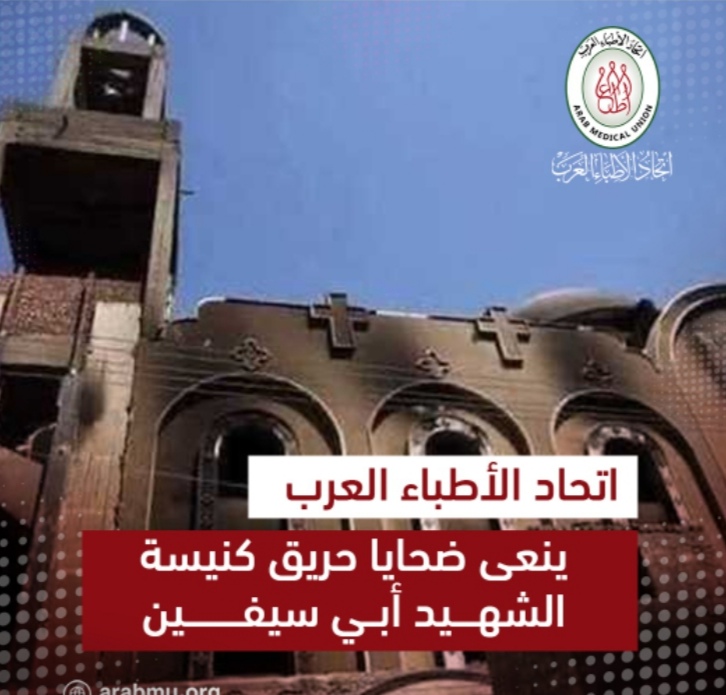 تقدم اتحاد الأطباء العرب على لسان أمينه العام الأستاذ الدكتور أسامة رسلان بخالص التعازي والمواساة لأسر الضحايا الأبرياء، إثر اندلاع حريق نشب بكنيسة الشهيد أبي سيفين في منطقة مطار إمبابة شمالي الجيزة، صباح اليوم الأحد 14 أغسطس.