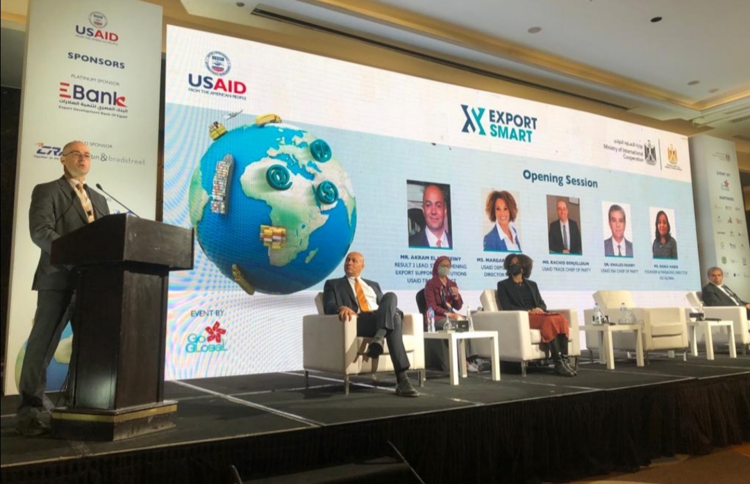 افتتح اليوم المعرض والمؤتمر الأول من نوعه في مصر و الشرق الأوسط “اكسبورت سمارت” والذي تنظمه شركة “جو جلوبال” – لتنمية الأعمال الدولية – بالتعاون مع مشروع تطوير التجارة وتنمية الصادرات في مصر  “TRADE” ومشروع الخدمات المُستدامة”SSA”  المُمولين من الوكالة الأمريكية للتنمية الدولية “USAID”، بفندق رويال مكسيم بالاس كمبنسكي في القاهرة الجديدة بهدف مساعدة المُصدرين من الشركات الصغيرة والمتوسطة على زيادة صادراتها بشكل مُستدام، وذلك تماشياً مع خطة الحكومة المصرية لزيادة حجم الصادرات المصرية إلى 100 مليار دولار خلال هذا العقد. ويأتي الملتقى تحت رعاية كل من وزارتي التجارة والصناعة و التعاون الدولي.