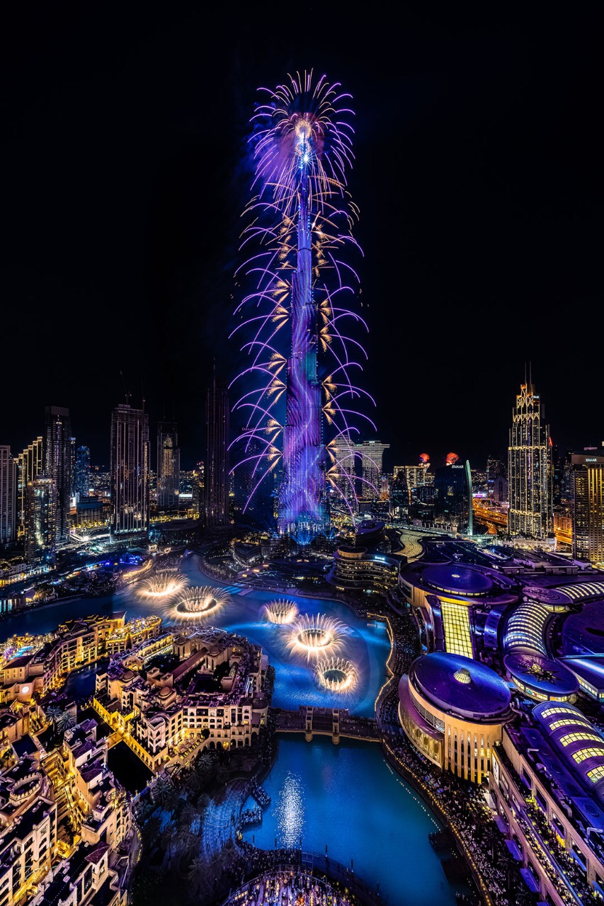 لمنح صورتك تركيباً جيداً وإحساساً بالمكان الذي صورت فيه الألعاب النارية، ابحث عن إبراز عنصرٍ ما في المقدمة والخلفية ضمن الإطار: على سبيل المثال، قمة برج خليفة أو الواجهة المنحنية لبرج العرب. وبينما تقدم الألعاب النارية في سماءٍ حالكة ألوناً جميلة، توفر العناصر الأخرى من قبيل مَعلمٍ أو مبنىً شهير الصورة عمقاً ومعنىً أكبر.
