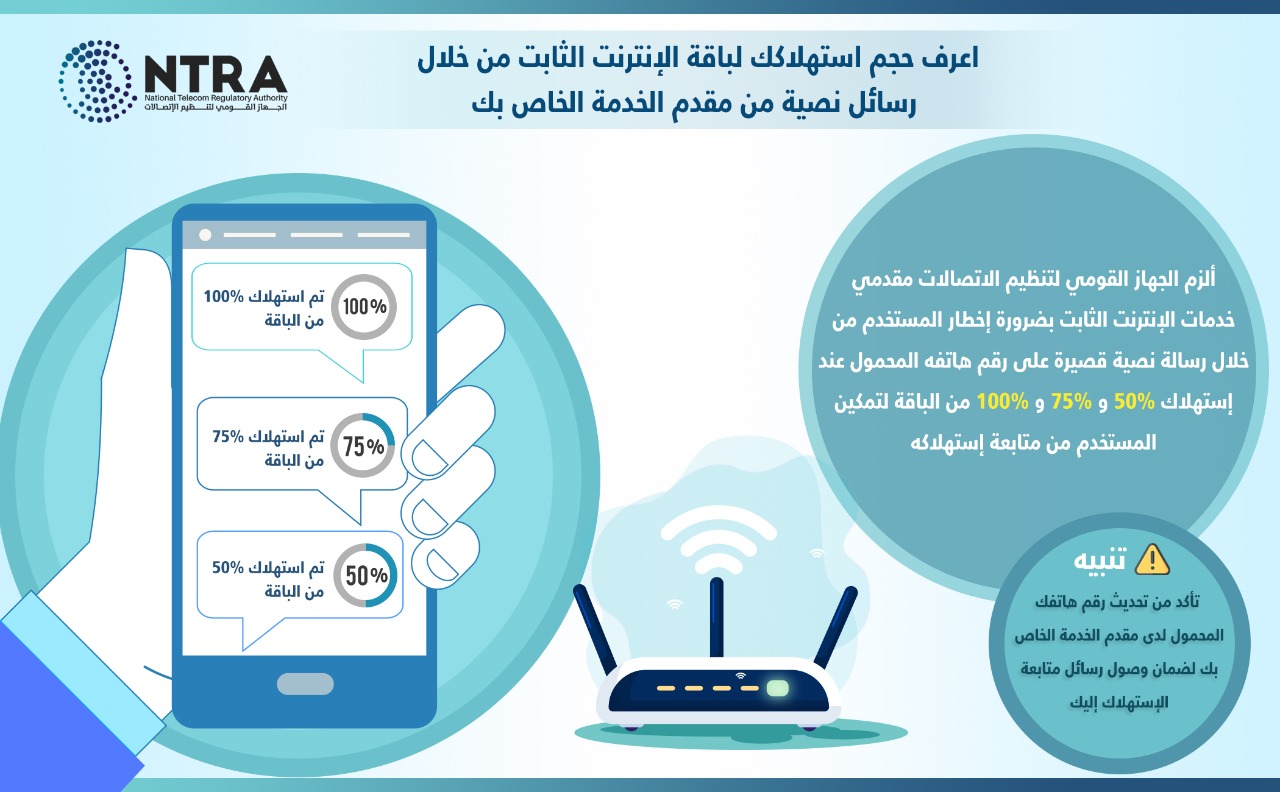 الجهاز القومي لتنظيم الاتصالات يلزم الشركات مقدمي خدمات الانترنت الثابت بإعلام المشتركين بحجم استهلاكهم بصفة دورية مجاناً