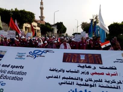 نظمت الاداره المركزيه للبرلمان والتعليم المدني ” الطلائع ” بوزاره الشباب والرياضه مسيره بحضور طلائع الجمهوريه اعضاء البرلمان ومراكز الشباب بمحافظه الاقصر والتي انطلقت من امام قاعه المؤتمرات حتي معبد الكرنك في محافظه الاقصر . وتاتي المسيره ضمن فاعليات برنامج مهرجان التنشئة الوطنية الثانى تحت عنوان ” تراثنا تاريخنا .. مصر سلام وامان ” والمقامه تحت رعايه الدكتور اشرف صبحي وزير الشباب والرياضه خلال الفتره من 23 وحتي 28 مارس الجاري بمدينه الاقصر . كما شارك في المسيره عدد من الاجانب المتواجدين بمدينه الاقصر ويهدف المهرجان الي بث روح الولاء والانتماء بين النشء وعمل معايشة تاريخية للمعالم الأثرية للاعتزاز والفخر بالهوية المصرية، وارسال رسالة من طلائع مصر للعالم ان مصر بلد السلام والأمان باللغات الإنجليزية والفرنسية والألمانية وتتضمنت فعاليات المسيرة اليوم حمل علم مصر ورسائل مكتوبة باللغات المختلفة والوقوف بسلاسل بشرية حاملة اعلام مصر والرسائل المكتوبة باللغات المختلفة “العربية /الإنجليزية /الفرنسية /الألمانية” لدعم السياحة وان مصر بلد السلام والأمان وفي مساء اليوم يقام عرض الصوت والضوء ويتم بث الرسالة صوتيا مسجلة بصوت الطلائع في نهاية العرض.