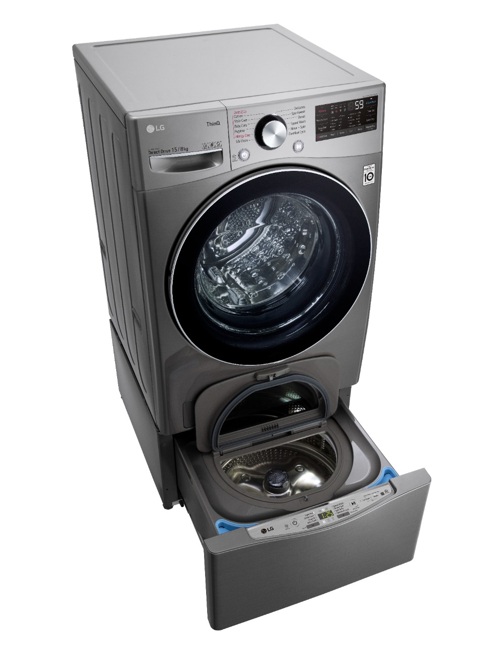 تتمثل إحدى المزايا الرئيسية في “توين ووش” من إل جي في وجود غسالة صغيرة بسعة 2.5 كيلوغرام ، بدرجة حرارة تصل إلى 90 درجة مئوية ، وبرامج مخصصة لملابس الأطفال والحرير. تتميز الغسالة الصغيرة بمحرك دفع مباشر يتحرك في 3 اتجاهات أثناء الغسيل ، لضمان أعلى كفاءة في التنظيف.