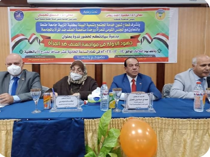 نظمت كلية التربية بجامعة طنطا ندوة تحت رعاية الدكتور محمود ذكي رئيس للجامعة وبحضور الدكتور حمدي شعبان نائب رئيس الجامعة لشئون خدمة المجتمع وتنمية البيئة والدكتور احمد هلال عميد الكلية وأقيمت الندوة تحت عنوان ” جهود الدولة في مناهضة العنف ضد المرأة بالتعاون مع المجلس القومي للمرأة برئاسة الدكتورة صفاء مرعي وعدد من قيادات ضباط الشرطة المعنيين بمكافحة العنف ضد المراة بمديرية امن الغربية .