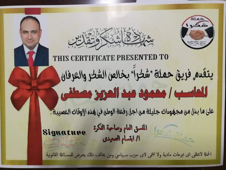 كرمت حملة شكرا العالمية الأستاذ محمود عبدالعزيز منسق الاتصال السياسي والأمن القومي بالاتحاد المصرى الدولي لمكافحة الإرهاب والفكر المتطرف لدوره الخدمي والتنموي في المجتمع.