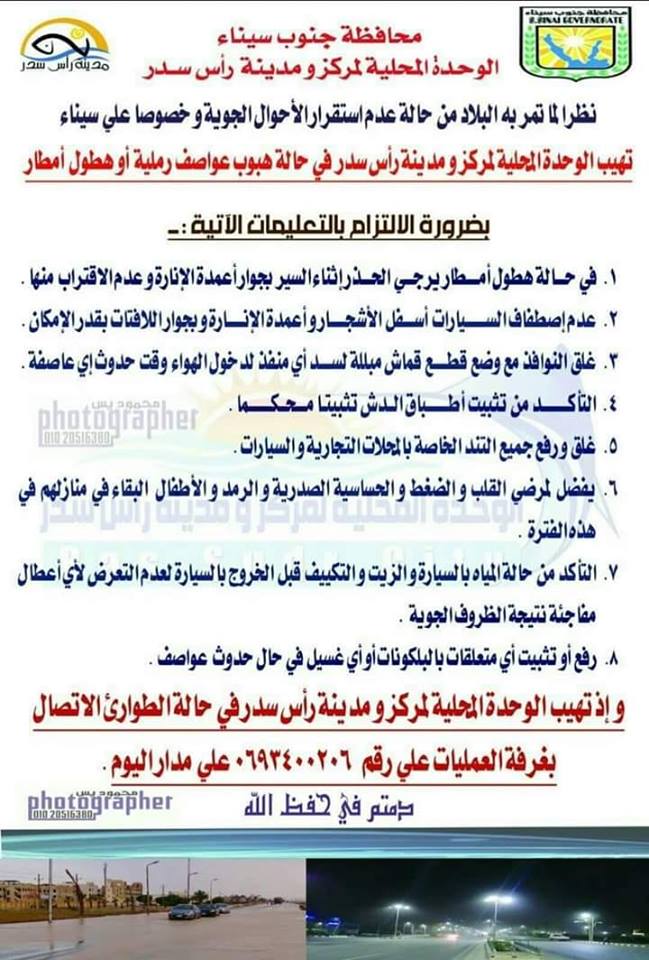 واهابت المدينه المواكنين بتوخي الحذر و اتباع التعليمات الآتيه حرصا علي سلامتكم و في هذا السياق تعلن غرفة العمليات بالوحدة المحلية لمركز و مدينة رأس سدر عن تلقيها اي شكاوي علي رقم ٠٦٩٣٤٠٠٢٠٦ علي مدار الساعة.