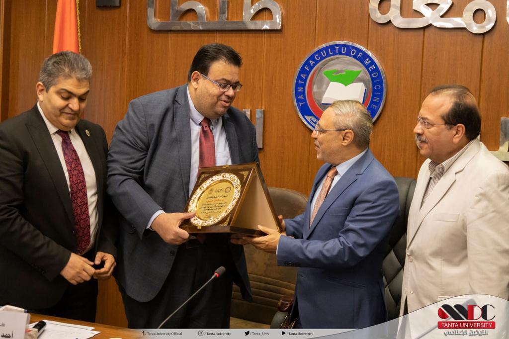 وأهدى الدكتور احمد غنيم درع الكلية للدكتور محمود ذكي رئيس الجامعة تقديرا لجهوده في دعم كلية الطب والمستشفيات الجامعية.