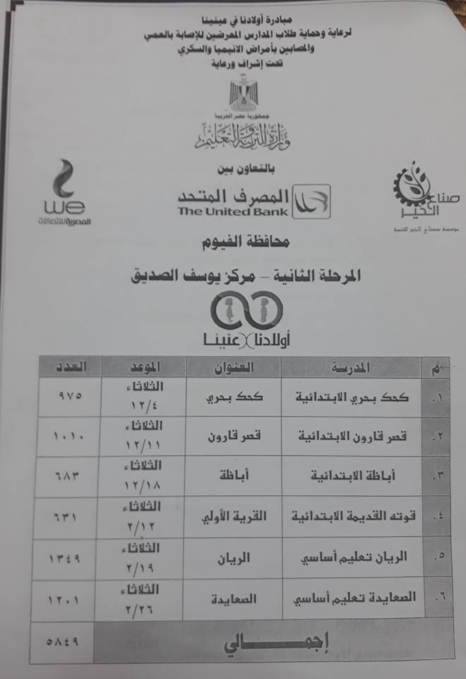 تحت رعاية اللواء عصام سعد محافظ الفيوم، تنطلق غداً الثلاثاء المرحلة الثانية من مبادرة “أولادنا فى عنينا” التى تأتى فى إطار التعاون بين محافظة الفيوم ومؤسسة صناع الخير، لرعاية وحماية طلاب المدارس المعرضين للإصابة بالعمى والمصابين بأمراض الأنيميا والسكرى تحت إشراف وزارة التربية والتعليم. وتشمل المرحلة الثانية من المبادرة عدد 6 مدارس بمركز يوسف الصديق بإجمالى 5849 تلميذ وتلميذة، هى كحك بحرى الابتدائية، وقصر قارون الابتدائية، وأباظة الابتدائية، وقوته القديمة الابتدائية، والريان تعليم أساسى، والصعايدة تعليم أساسى.